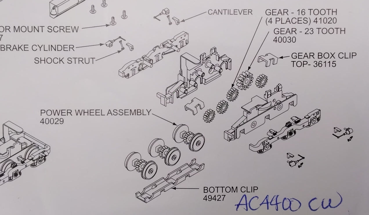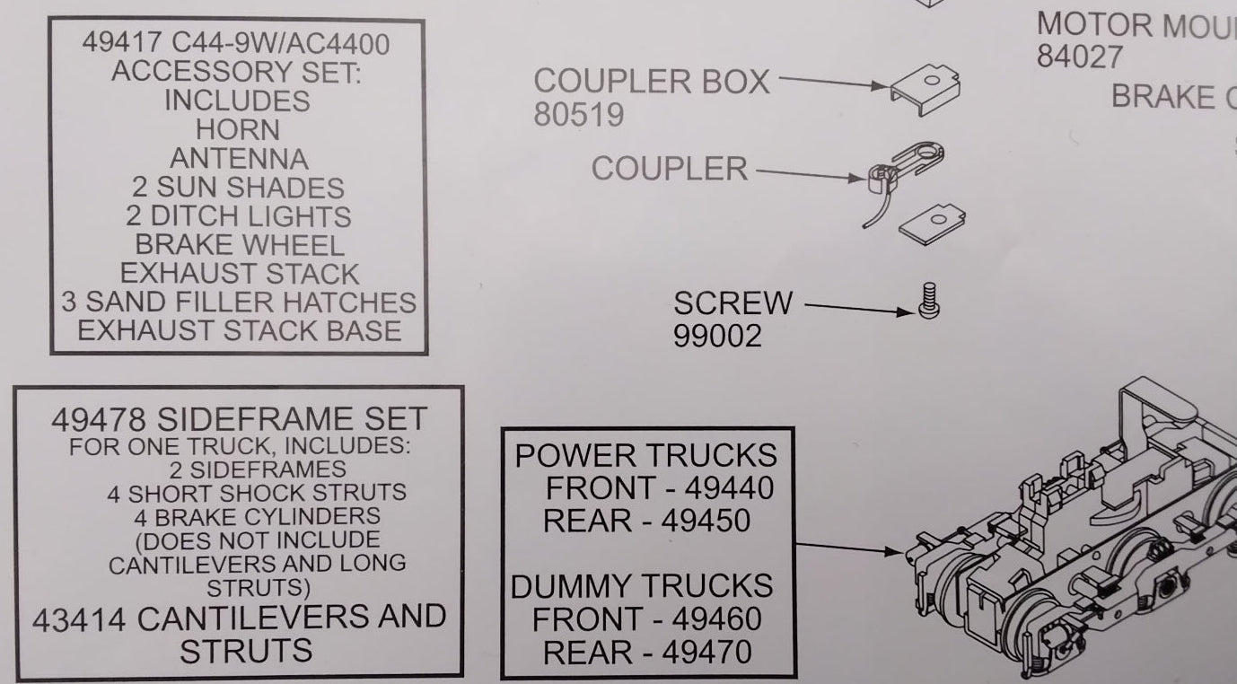 AC4400 Sideframe Set (plastic) - Fits Athearn Trucks 4 sideframes, 8 short shock struts, 8 brake cylinders, (does not include cantilevers and long struts) Those are available as part number: Ath 43414 (8 cantilevers and 8 long struts) (Not included)